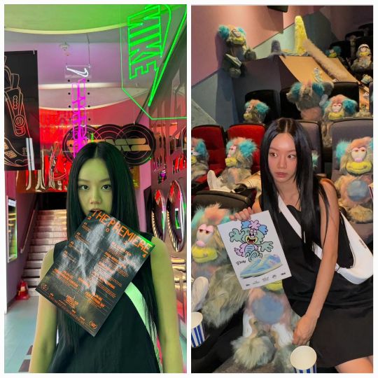 사진의 배경도 눈길을 끈다. 혜리가 앉아 있는 영화관 좌석 뒤로는 다양한 색깔의 인형들이 자리하고 있는데, 이 인형들은 ‘비스티’로 보인다. 다채로운 파스텔 색상과 독특한 디자인이 특징인 이 인형들은 공간에 독특하고 몽환적인 분위기를 더하며, 혜리의 단정한 블랙 패션과 대비를 이루어 그녀의 존재감을 더욱 돋보이게 만든다. 인형들로 가득 찬 좌석은 다소 환상적인 느낌을 주어 사진을 보는 이들에게 흥미로운 시각적 경험을 선사한다.