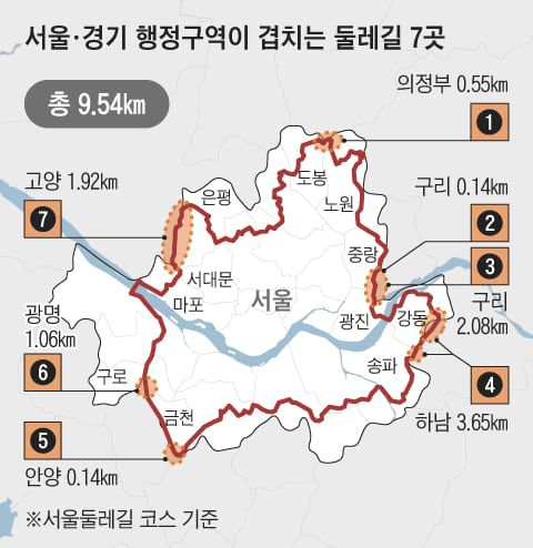 문제는 서울둘레길 전체 구간 중 10㎞ 정도가 행정구역상 경기도 지역에 있거나 서울·경기의 경계를 오간다는 점이었다. 서울시는 이름은 모두 ‘서울둘레길’로 지정해야 한다고 주장했지만, 경기도는 “아무리 길이가 짧아도 경기도 땅”이라며 반발했다. 경기도는 ‘한누비길’을 대안으로 제시했다. 경기도 관계자는 “한강의 ‘한’과 두루 누빈다는 뜻의 ‘누비’를 합친 이름”이라고 했다.