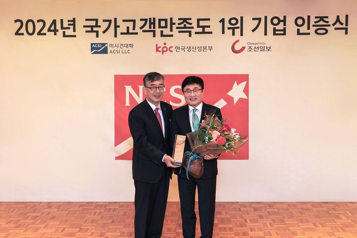 [서울=뉴시스] 김진아 기자 = 워커힐 호텔앤리조트가 한국생산성본부가 주관하는 고객만족 서비스 품질 평가인 2024년 국가고객만족도(NCSI) 조사에서 호텔서비스업 부문 1위로 선정됐다고 4일 밝혔다. 사진은 한국생산성본부 안완기(왼쪽) 회장과 워커힐 호텔앤리조트 현몽주 총괄이 기념촬영을 하고 있다. (사진=워커힐 호텔앤리조트 제공) 2024.09.04. photo@newsis.com *재판매 및 DB 금지