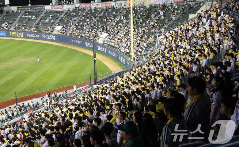 서울 송파구 잠실야구장에서 열린 '2024 신한 SOL 뱅크 KBO리그' KT위즈와 LG 트윈스의 경기에서 야구팬들이 응원을 하고 있다. /뉴스1 ⓒ News1 김명섭 기자 |