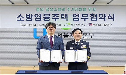 (서울=연합뉴스) 5일 서울 강남구 LH 서울지역본부 대회의실에서 열린 소방영웅주택 시범사업 추진을 위한 업무협약 체결식에서 박현근 LH서울지역본부장(왼쪽)과 황기석 서울소방재난본부장이 기념 촬영하고 있다. 2024.9.5 [LH 제공. 재판매 및 DB 금지]