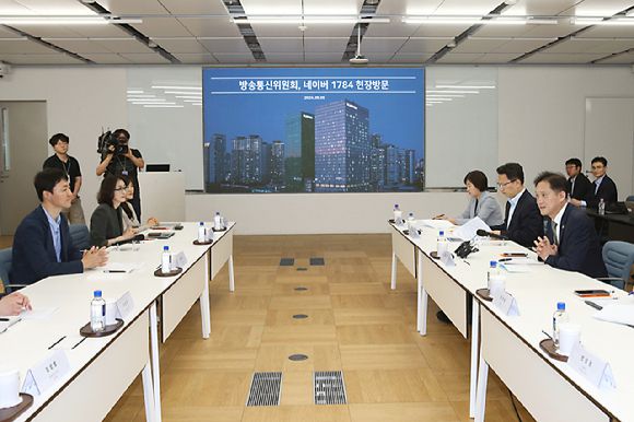 5일 경기도 성남시 네이버 본사를 방문한 김태규 방송통신위원장 직무대행(오른쪽 가운데)이 네이버 관계자들을 만나 논의하고 있다. [사진=방송통신위윈회]