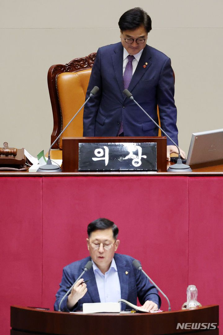 [서울=뉴시스] 조성우 기자 = 우원식 국회의장이 28일 오후 서울 여의도 국회에서 열린 제416회 국회(임시회) 제1차 본회의에서 방송문화진흥회법 일부개정법률안에 반대하는 유용원 국민의힘 의원의 필리버스터(무제한 토론) 중 사회를 보다 잠시 일어서고 있다. 2024.07.28. xconfind@newsis.com
