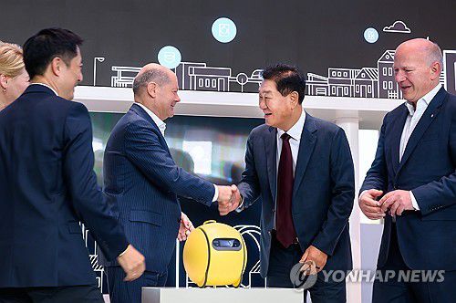 (서울=연합뉴스) 올라프 숄츠 독일 총리가 6일(현지시간) 독일 베를린에서 열린 'IFA 2024' 삼성전자 전시관을 방문, 한종희 삼성전자 대표이사 부회장과 만나 악수하고 있다. 2024.9.6 [삼성전자 제공. 재판매 및 DB 금지]