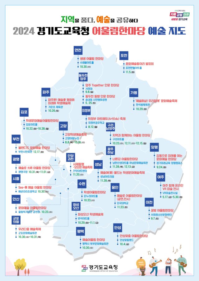 경기도교육청은 7일 이천을 시작으로 12월까지 25개 교육지원청과 함께 지역 별로 특색을 살린 ‘예술어울림한마당’을 개최한다고 6일 밝혔다.