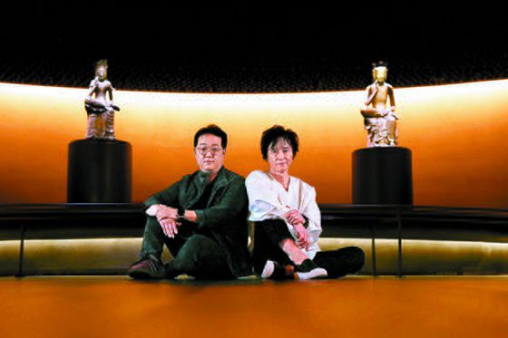 9월 7일과 8일 국립중앙박물관 전용극장 용에서 공연 '초월'을 선보인 양방언 작곡가(오른쪽)와 민새롬 연출가가 국보 금동미륵반가사유상이 전시된 '사유의 방'에서 포즈를 취했다. 사진 국립박물관문화재단 |