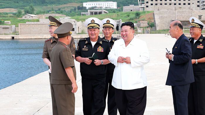 대형 함선들을 건조 중이라고 밝혔는데 공개한 사진을 보면, 대형 선박 접안이 가능한 것으로 보이는 시설에서 김정은이 지시하는 모습이 보입니다.
