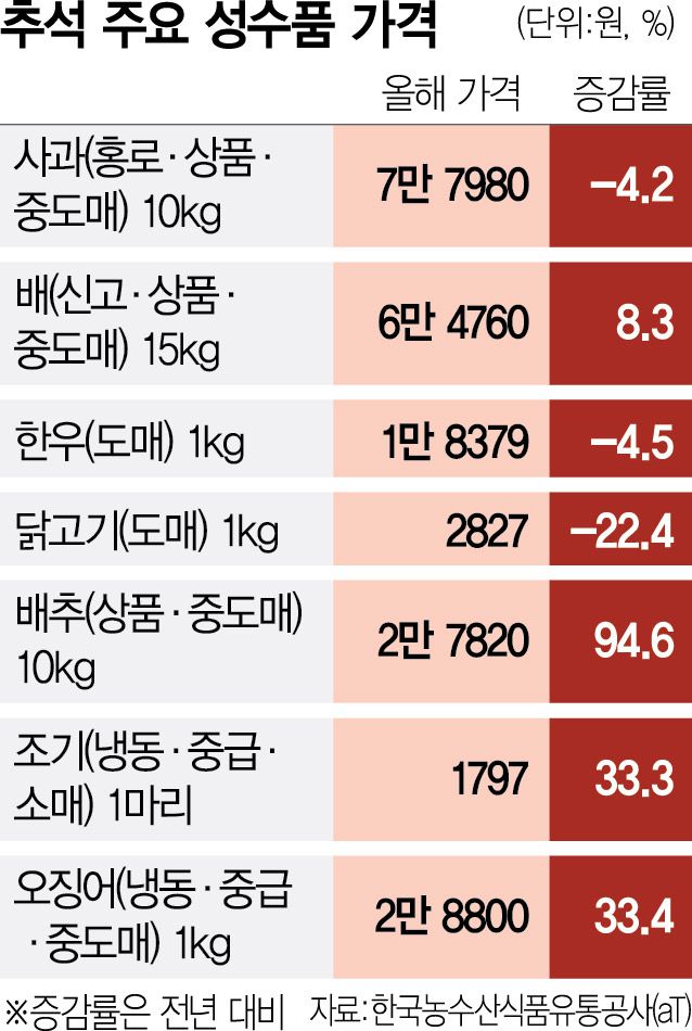 물가조사 기관에 따르면 올해 4인 가족 기준 추석 차례상 비용이 사상 처음으로 지난해 추석보다 감소한 것으로 나타났지만 소비자들은 체감하지 못하는 분위기다. 특히 지난달 폭염과 열대야로 작황이 부진한 배추, 무 등은 추석을 앞두고 수요가 늘면서 가격이 크게 올랐다. 애호박, 시금치 등의 채소는 차례상에 올라가지는 않지만 서민들의 밥상에 자주 오르는 품목들도 급등해 부담이 커진 상황이다.
