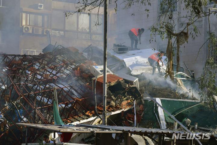 [다마스쿠스=AP/뉴시스] 지난 4월1일 시리아 다마스쿠스에서 구조대가 이스라엘의 공습으로 파괴된 건물 잔해를 수색하고 있다. 시리아와 이란 당국은 이스라엘이 시리아 주재 이란 영사관을 공습해 이란 혁명수비대 장성 2명과 장교 5명이 사망했다고 밝혔다. 2024.04.02. |