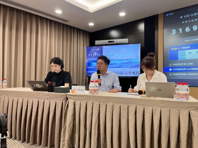 레이 장 알리익스프레스 대표(가운데)가 3일 중국 저장성 항저우시에 위치한 알리바바 본사 시시캠퍼스에서 한국 기자들의 질문에 답하고 있다./사진=김민우 기자