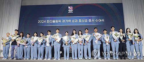 파리올림픽 경기력 성과포상금 정서 수여식(서울=연합뉴스) 강민지 기자 = 10일 오후 10일 오후 서울 송파구 올림픽파크텔에서 열린 '서울올림픽 개최 36주년 기념식'에서 '2024 파리올림픽 경기력 성과포상금 증서 수여식'에 참석한 선수들이 기념 촬영을 하고 있다. 2024.9.10 mjkang@yna.co.kr