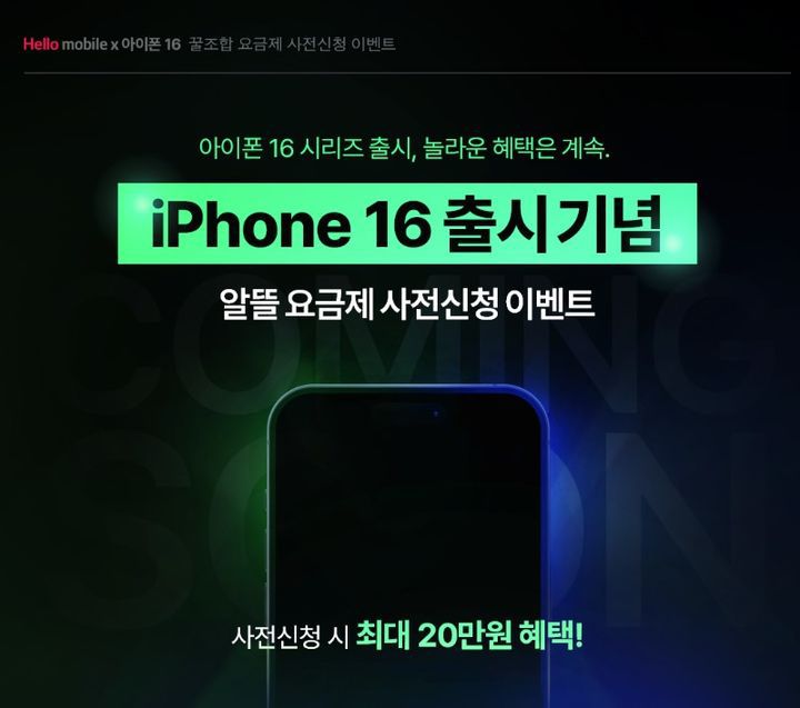 LG헬로비전의 알뜰폰 브랜드 헬로모바일은 아이폰16 정식 판매일인 오는 20일 전까지 자사 직영몰에서 유심과 이심(eSIM) 사전신청 프로모션을 진행한다. 원하는 유심 또는 이심 요금제에 사전신청 후 개통하고 아이폰16 자급제 단말기 일련번호를 등록하면 이용자 전원에게 6만원 상당의 상품권을 준다.