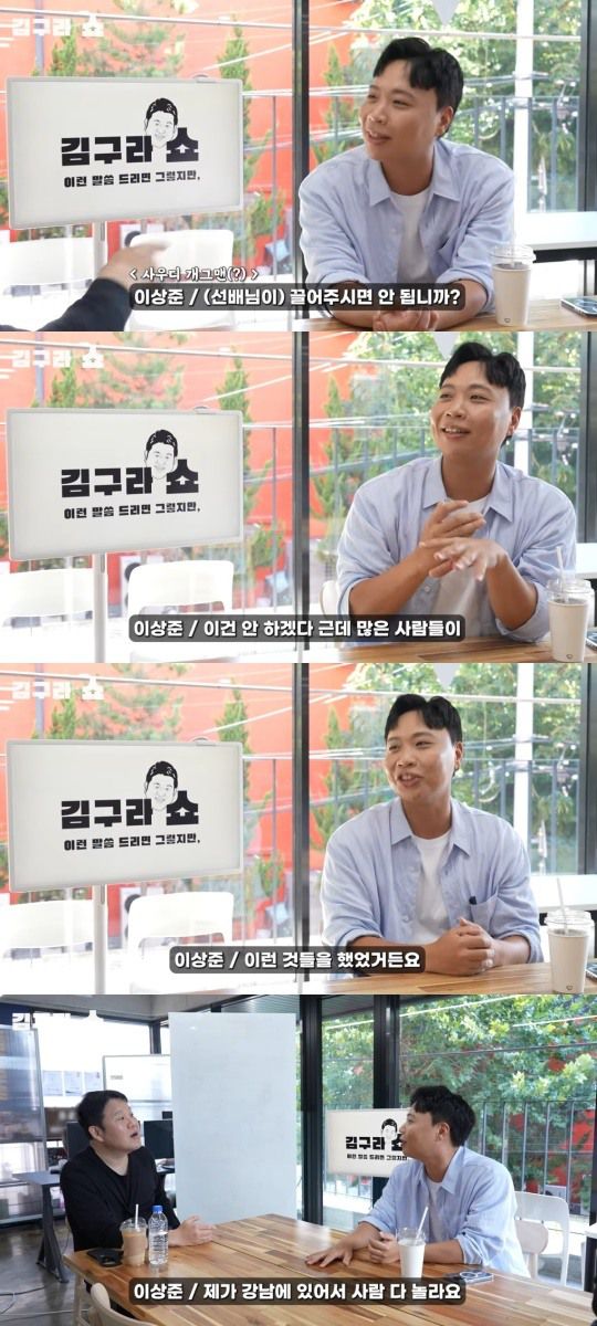 김구라는 이상준에게 "네가 유튜브를 하고 잘 되는 것도 알고 있었다. 한편으로는 '이상준도 50만씩 되는데 내가 이거 뭐야' 이런 생각도 했다"고 솔직히 말하며 "좀 더 열심히 해야겠다는 거다. 유튜브는 지명도로 하는 게 아니라 진정성을 갖고 하는데 상준이가 나름 영역이 있더라. 연애 관련 심리 등 최초로 시도한 게 많았다"고 짚었다.