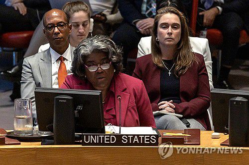 유엔 안보리 회의에서 발언하는 토머스-그린필드 주유엔 미 대사 |