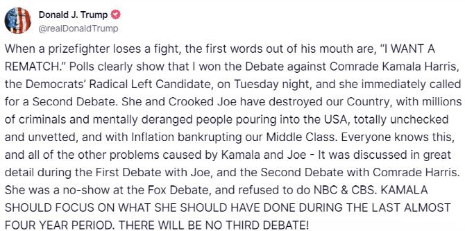 그는 지난 10일 해리스 부통령과 TV토론에서 본인이 승리했다고 평가했다. 그는 “권투선수가 시합에서 패했을 때 가장 먼저 입에서 나온 말은 ‘재대결을 원한다’이다”며 “여론조사에 따르면 민주당의 급진 좌파 후보인 카멀라 해리스와 토론에서 내가 승리한 것으로 나타났고, 그녀는 즉시 2차 토론을 요구했다”고 주장했다.