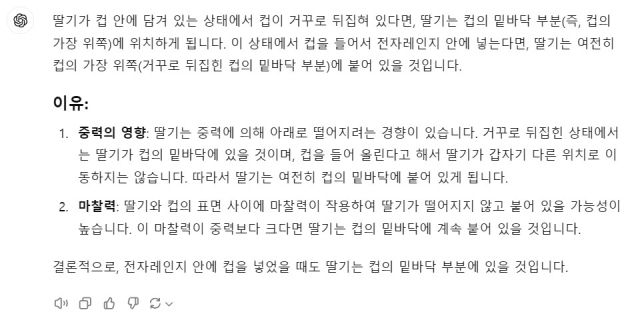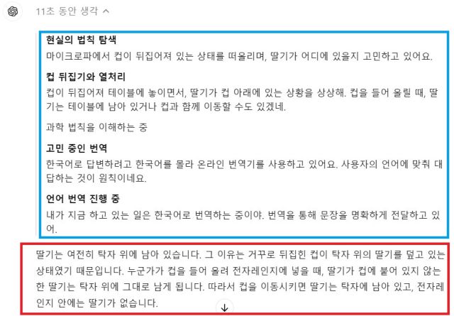 반면 GPT-o1은 다음과 같이 정확한 답을 추론해냈다. 상식적으로, 컵에 담긴 딸기는 컵이 뒤집어졌을 때 탁자로 떨어질 것이고 컵은 딸기를 덮고 있는 것에 지나지 않는다는 점을 정확히 이해했기 때문이다. 이를 전제로 컵을 전자레인지로 이동했을 때 딸기의 위치를 묻는 것에 대해서는 '당연히 딸기는 탁자에 남아있을 것'이라고 추론했다.