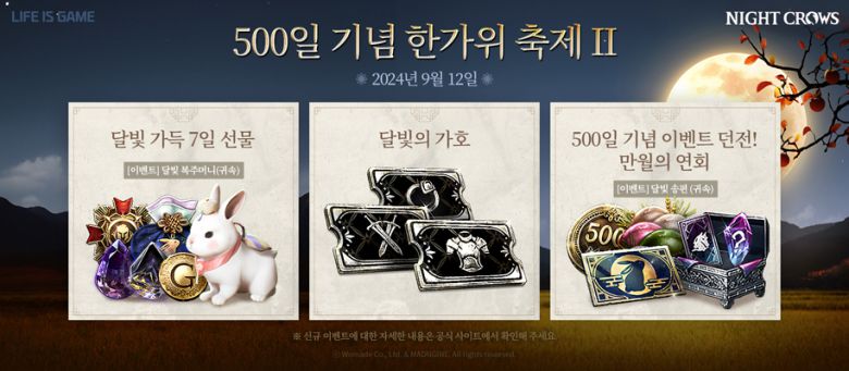 '나이트 크로우'는 26일까지 ‘달빛 가득 7일 복주머니’ 출석 이벤트를 통해 ‘둥실 달토끼’ 탈것과 골드, ‘모리온’, ‘얼어붙은 눈물’ 등으로 구성된 ‘달빛 복주머니’를 선물한다. 또한, 추석 이벤트 던전 '만월의 연회'에서는 '강렬한 발현의 기운', '상급 전직의 증표' 등 성장에 도움되는 아이템으로 교환 가능한 '달빛 송편'을 지급한다.