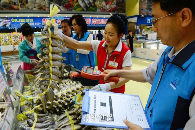 2013년 지방자치단체 식품안전조사반원들이 서울의 한 대형할인매장에서 제수용품 원산지 특별점검을 하는 모습. 사진은 기사와 무관함. 김영민 기자 viola@kyunghyang.com |