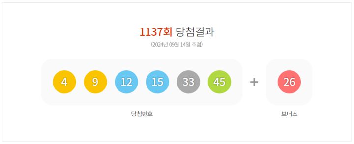 지난 14일 추첨된 1137회 로또당첨번호는 4, 9, 12, 15, 33, 45, 보너스 번호 26이다.