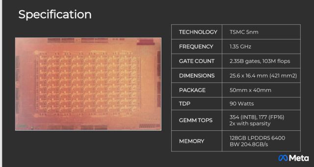 이번에 핫칩스에서 발표한 2세대 MTIA는 TSMC 5나노 공정을 이용했습니다. 23억5000만개의 트렌지스터를 가졌고요, 이 칩 역시 HBM을 활용하지 않고 저전력이 특징인 LPDDR D램과 연동한 게 특징입니다.