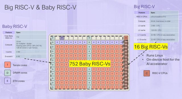 블랙홀의 경우 TSMC의 6나노 공정으로 만들었다고 합니다. 블랙홀의 특이한 점은 회사가 자체적으로 개발한 AI 연산 코어인 '텐식스(tensix)' 코어를 140개 장착했다는 것입니다. 이들이 지금까지 개발한 3개의 AI 칩 중 텐식스 코어의 코어 수가 가장 많습니다. 이 코어들이 모여서 16비트 기준 372테라플롭스의 연산속도를 낸다고 합니다. 또 16개의 CPU 코어를 배치했는데요. 텐식스와 CPU 코어 모두 arm도 아니요, 인텔의 x86 기반도 아닌 ‘RISC-V’ 기반으로 설계됐습니다. 또 엔비디아의 GPU 통신 기술인 인피니밴드(Infiniband)에 대응해 범용성과 확장성이 장점인 이더넷(ethernet)이라는 표준을 적극 채용하는 점도 강조했습니다.