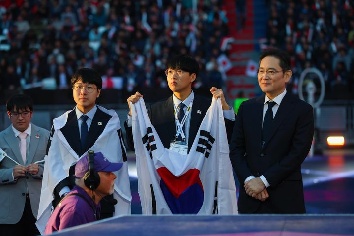 [서울=뉴시스] 조수정 기자 = 이재용 삼성전자 회장이 15일(현지시각) 프랑스 리옹 소재 그루파마스타디움에서 열린 국제기능올림픽 폐회식에 참석, 메달 시상을 준비하고 있다. (사진=삼성전자 제공) 2024.09.18. photo@newsis.com *재판매 및 DB 금지