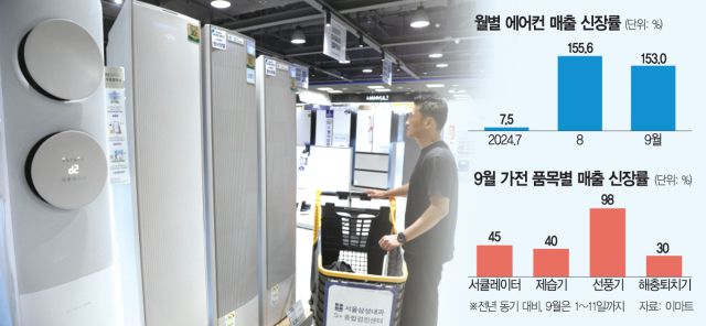 이마트에 따르면 이달 1일부터 11일까지 에어컨 매출은 전년 동기 대비 약 153% 뛰었다. 이는 7~8월과 비교해도 높은 수치로 한여름만큼 매출 증가세를 보였다. 올해 에어컨 매출은 장마철인 7월 전년 동기 대비 7.5% 늘었다가 본격적인 폭염이 시작된 8월에 155.6% 뛰었다.