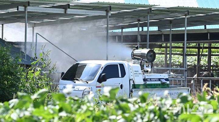 [이천=뉴시스] 김종택 기자 = 소 바이러스성 질병인 럼피스킨병이 발생한 경기도 이천시 한 젖소농장 인근에서 1일 방역 차량이 소독작업을 하고 있다. 2024.09.01. jtk@newsis.com