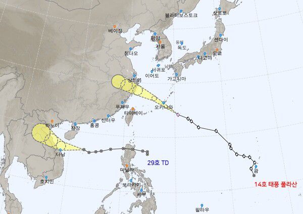 ©기상청 : 2024년 태풍 14호 '풀라산' 과 29호 열대저압부의 현재 위치와 이동 예상경로 |