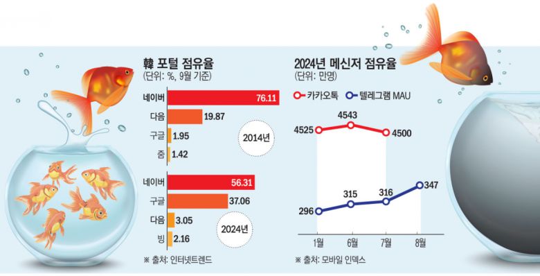 포털 점유율만 봐도 확인할 수 있다. 초록창으로 국내 포털 시장을 점령했던 네이버의 위상은 예전 같지 않다. 인터넷트렌드에 따르면 2014년 76.11%에 육박했던 네이버의 시장 점유율은 10년 만에 56.31%로 겨우 절반을 넘겼다. 같은 기간 19.87%였던 다음의 점유율은 10년 사이에 3.05%로 85% 가까이 하락했다.