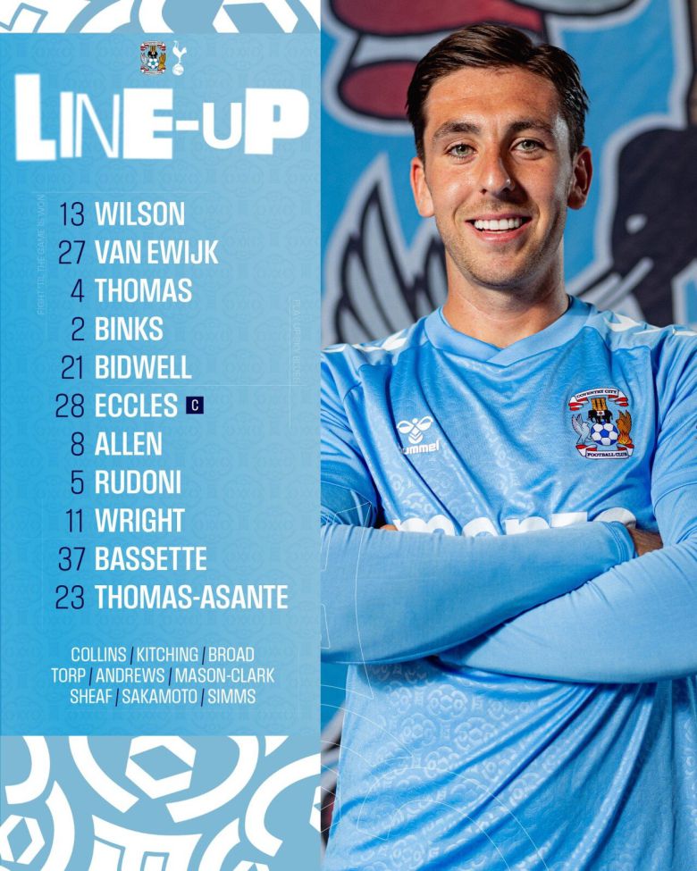 홈팀 코번트리는 4-3-3 전형으로 나섰다. 벤 윌슨 골키퍼를 비롯해 밀란 판 에위크, 바비 토마스, 루이스 빙크스, 비드웰이 수비를 구성했다. 중원은 조시 에클레스, 제이미 엘런, 잭 루도니가 맡았다. 측면에 하지 라이트와 브랜던 토마스-아산테, 최전방에 노먼 바셋이 출격했다.