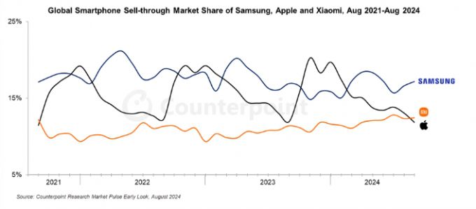 다만, 애플이 9월 초 아이폰16 시리즈를 출시하면서 당분간 판매량이 늘 전망이므로 순위는 다시 원상 복귀될 전망이다. 카운터포인트리서치는 지난해 하반기처럼 애플이 삼성전자 점유율을 넘어 1위 자리를 탈환할 가능성도 있다고 점쳤다.