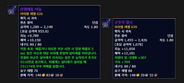 운명매듭 무기는 단순 능력치 외에도 강력한 착용 효과를 갖고 있다. 시뮬레이션 크레프트의 계산으로는 암흑 사제가 해당 무기를 사용할 경우 착용 효과로 인해 신화 안수레크 무기보다 DPS적으로 0.8%만큼 이득을 본다. 그만큼 우수한 무기다.