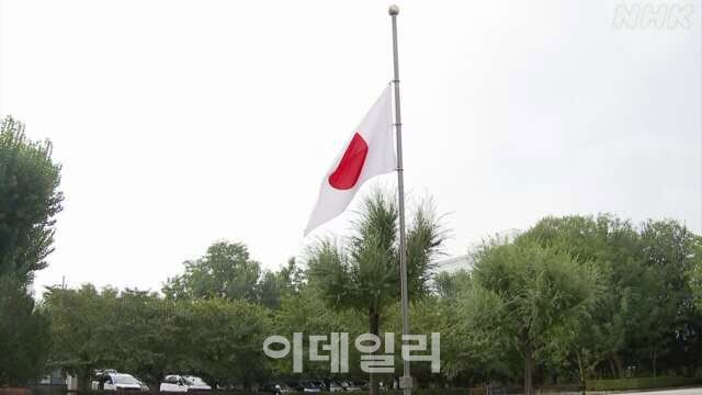 19일 중국 베이징에 있는 주중 일본대사관에 괴한의 급습으로 사망한 초등학생을 추모하기 위해 조기가 걸려 있다.(사진=일본 공영방송 NHK 갈무리)