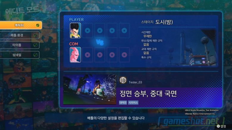 튜토리얼은 크게 언급할 요소는 없어서 생략하고, 대전 모드를 보면 모두 언락된 캐릭터가 눈길을 끈다. 앞서 진행한 체험회에서는 ‘드래곤볼Z’와 ‘드래곤볼 슈퍼’ 캐릭터만 사용할 수 있었으나, 이번 체험회 버전은 ‘드래곤볼Z 구 극장판’, ‘드래곤볼GT’ 캐릭터가 대거 등장한다.