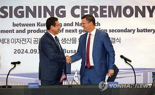 (부산=연합뉴스) 손형주 기자 = 20일 오후 부산 사상구 금양 본사에서 열린 미국 나노테크 에너지와 금양의 화재 억제력을 갖춘 차세대 배터리 공동개발과 생산을 위한 MOU 채결식에서 류광지 금양 회장과 커티스 칼라 미국 나노테크 에너지 최고운영책임자가 악수를 하고 있다. 양측은 나노테크 에너지의 그래핀 소재 기술과 금양이 에스엠랩을 통해 구축한 하이니켈 97% 양극 소재 기술을 접목해 화재 억제력을 갖춘 원통형 배터리를 공동 개발, 생산하는 방안을 추진한다고 밝혔다. 2024.9.20