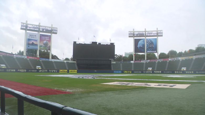 텅 빈 관중석과 더그아웃도 모두 비에 흠뻑 젖었습니다.