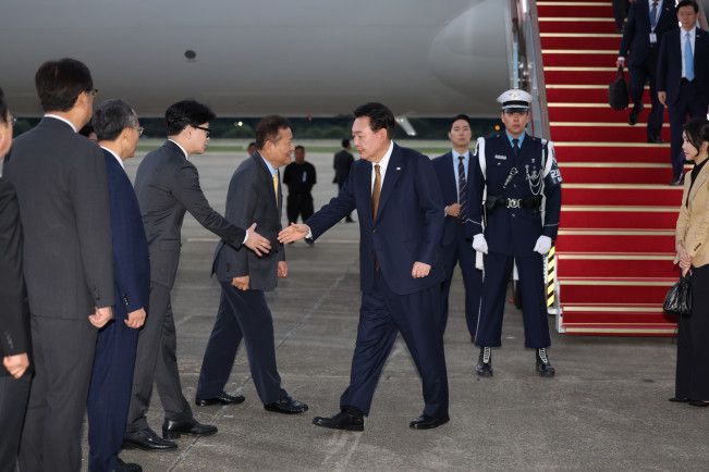 윤 대통령과 부인 김건희 여사는 이날 오전 6시 9분쯤 대통령 전용기인 공군 1호기를 타고 경기 성남 서울공항에 도착했다.