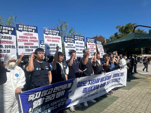 전국철도지하철노동조합협의회는 23일 서울 영등포구 국회 앞에서 기자회견을 열고 "철도·지하철 현장에서 중대재해가 연이어 발생하고 있다"며 "철도·지하철 노동자들은 왜 계속해서 일터에서 다치고, 병들고, 죽어야만 하는가"라고 했다.