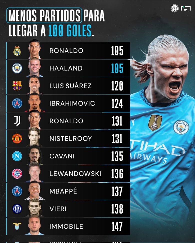 지난 2022년 여름 맨시티로 이적한 홀란은 이곳에서 클럽 통산 105번째 경기 만에 100호 골을 터뜨리며 새로운 역사를 썼다. 크리스티아누 호날두가 2011년 레알 마드리드 소속으로 105번째 경기에서 100호 골을 터뜨린 것과 타이기록이다.