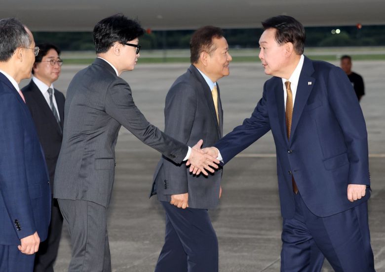 윤석열 대통령이 22일 성남 서울공항에서 체코 공식 방문을 마치고 귀국하며 마중 나온 국민의힘 한동훈 대표와 악수하고 있다. 2024.9.22. 대통령실사진기자단