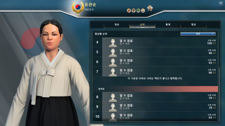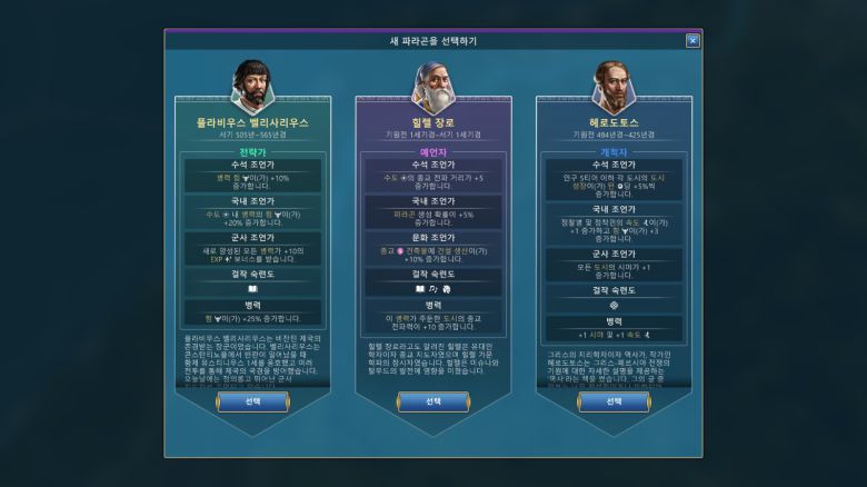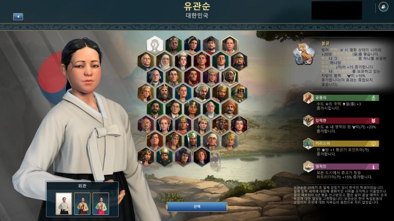 일단 복수 지도자가 존재하는 국가가 있고 지도자들마다 같은 국가라도 부가 특성 또한 다르게 구성되어 있다보니 국가 특색을 보고 국가를 선택한다는 느낌이 없어 정확히는 원하는 지도자를 골라 플레이한다는 느낌이 더 강하다. 물론 국가를 보고 그 다음 지도자를 고르는 플레이어도 있을 것이고, 애초에 복수의 지도자란 선택지가 없는 국가가 더 많으니 이쪽에 한해서 하는 이야기이지만 말이다. 어찌됐든 대한민국 지도자는 어느 쪽을 골랐느냐에 따라 성향도 달라지는 편이다. 세종대왕 쪽은 건축과 연구, 종교에 집중됐다면 유관순을 지도자로 고르는 경우 방어전이나 수도 내에 국한되지만 상대적으로 세종대왕에 비해 군사적 안정감을 얻을 수 있다.