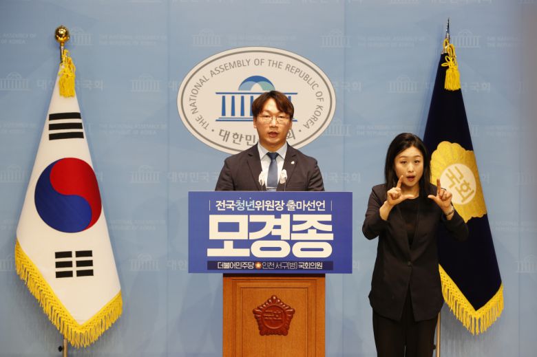 모경종 더불어민주당 의원이 24일 국회 소통관에서 민주당 전국청년위원장 후보 출마선언 기자회견을 하고 있다. 의원실 제공