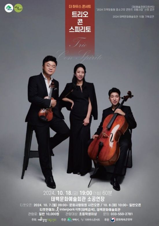 강원특별자치도 태백시(시장 이상호)는 오는 10월 18일 오후 7시에 태백문화예술회관 소공연장에서 태백문화예술회관 10월 기획공연으로 더 하우스 콘서트 3탄 ‘트리오 콘 스피리토’를 개최한다.