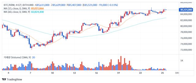 25일 오후 1시 빗썸에서 비트코인(BTC)은 전일 대비 1.23% 상승한 8553만 3000원을 기록했다. 이더리움(ETH)은 전일 대비 0.60% 오른 351만 4000원, 바이낸스코인(BNB)은 0.06% 하락한 80만 8000원, 솔라나(SOL)는 3.38% 상승한 20만 1600원, 리플(XRP)은 0.90% 오른 789원이다.