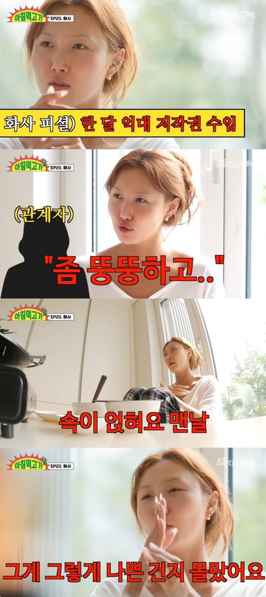 첫 느낌이 좋은 만큼 화사가 직접 작업한 히트곡들의 인기에 대해 예감했었냐는 질문도 이어졌다. 화사는 “만들면서 빨리 나오고 싶다는 느낌이었다”라고 말했다. 이에 장성규는 “저작권료가 한창 뜨거울 때 얼마 정도 들어오냐”라고 물었다. 화사는 “그렇다”면서도 “잘 안 봤다. 돈을 많이 안 본다. 일부러. 그런 거에 혹시나 신경 쓰일까봐. 거의 억대 정도”라고 솔직하게 밝혔다.