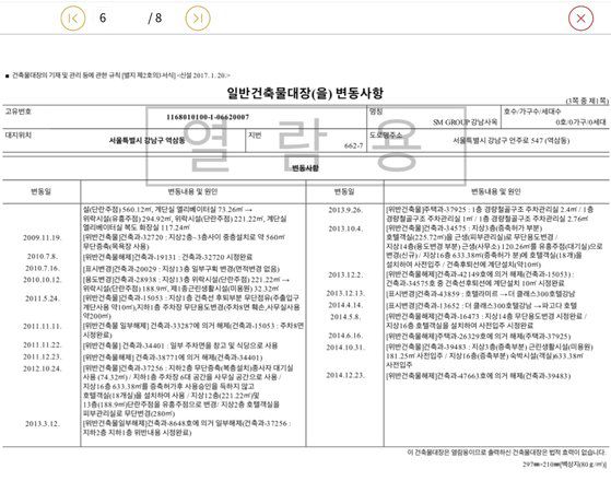 SM그룹 강남사옥의 건축물대장. 특별법을 적용해 건물을 증축한 내용과 호텔에서 업무시설로 용도변경 된 내용 등이 명시돼 있다. 자료 법무부