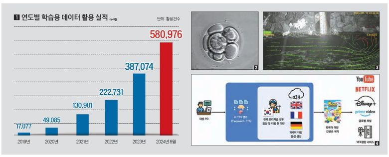 한국지능정보원이 운영하는 국내 최대 AI 학습용 데이터 제공 플랫폼 ‘AI허브’의 연도별 데이터 활용현황(①)과 AI 허브 데이터를 활용한 사례들(②③④). [사진 한국지능정보원] |