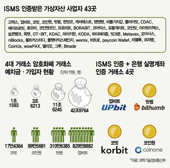 특금법은 3개월의 유예기간을 거쳐 2021년 9월 25일부터 본격적으로 시행되었는데요. 당시 63개의 가상자산 거래소 중 29곳만이 개정 특금법에 따라 사업자 신고를 완료했어요. 그 중 신고 요건인 은행과의 실명확인 가능 입출금 계정 제휴와 정보보호관리체계(ISMS) 인증을 모두 갖춘 곳은 업비트, 빗썸, 코인원, 코빗 뿐이었어요. 업비트는 케이뱅크, 빗썸과 코인원은 NH농협은행, 코빗은 신행은행과 제휴를 맺었고요. 이후 고팍스가 전북은행과 실명확인 가능 입출금계정 제휴를 맺으며 우리에게 익숙한 5대 원화 거래소 체제가 만들어졌습니다.