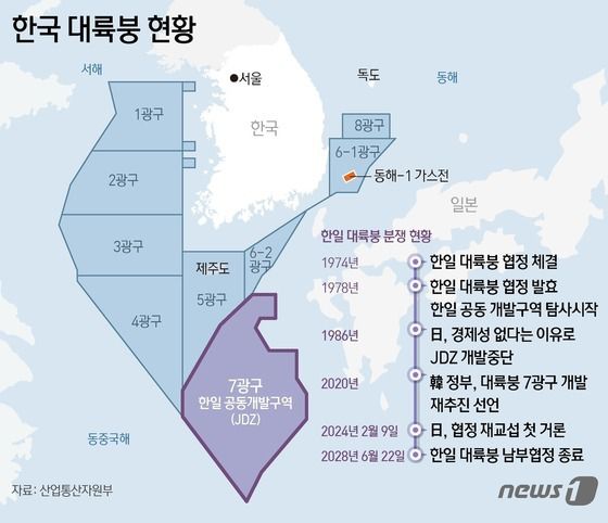 (서울=뉴스1) 정윤영 기자 = '자원 빈국' 국가인 한국이 반세기 만에 '산유국의 꿈'을 이룰 수 있을까. 한일이 약 40년 만에 중단됐던 공동개발협정(JDZ) 대화를 실시하기로 하면서 '대륙붕 7광구' 탐사 재개 가능성이 주목된다.